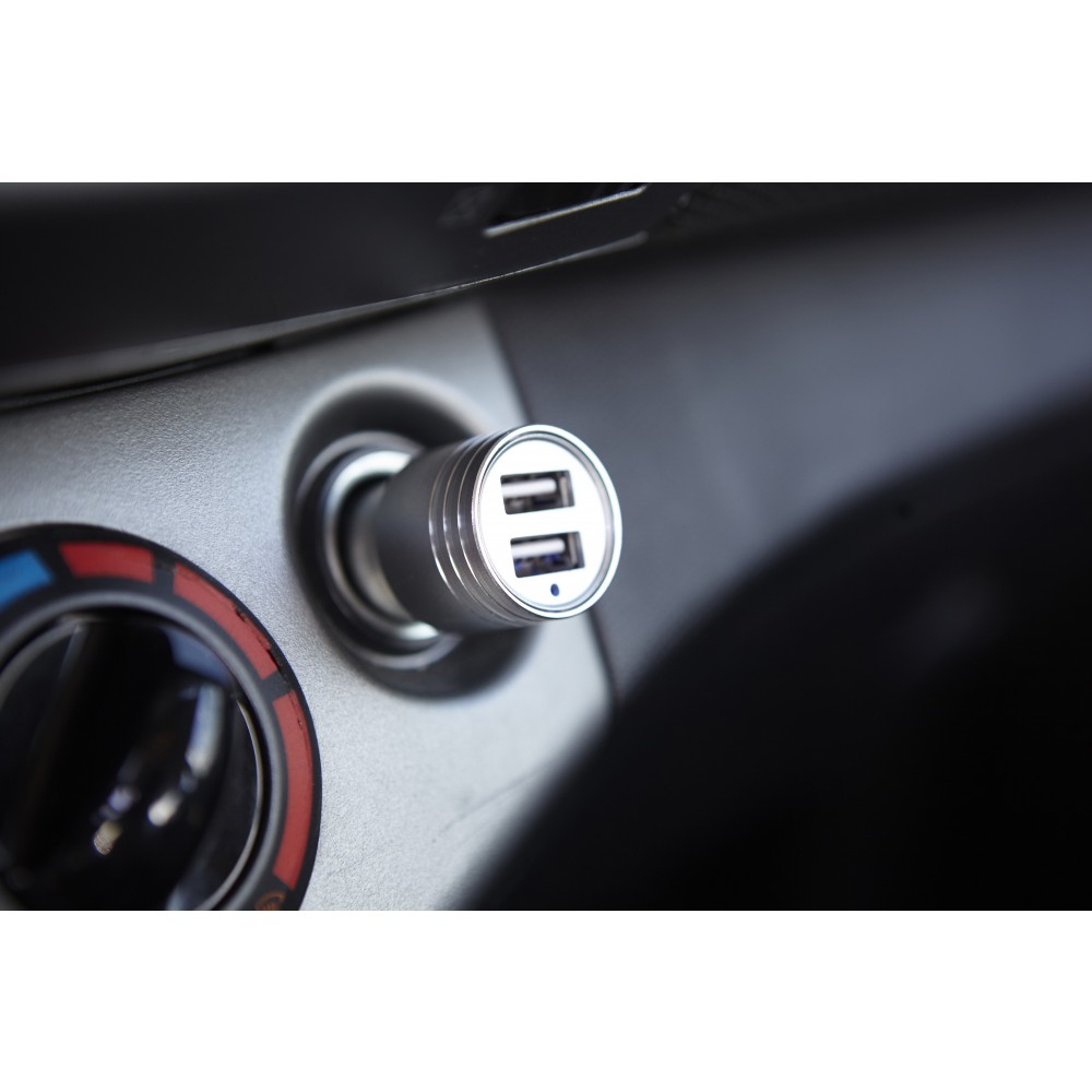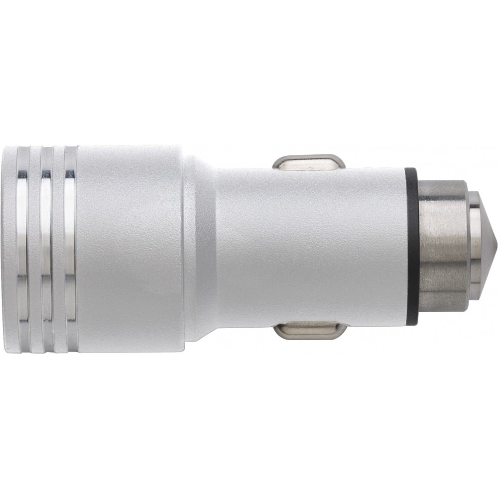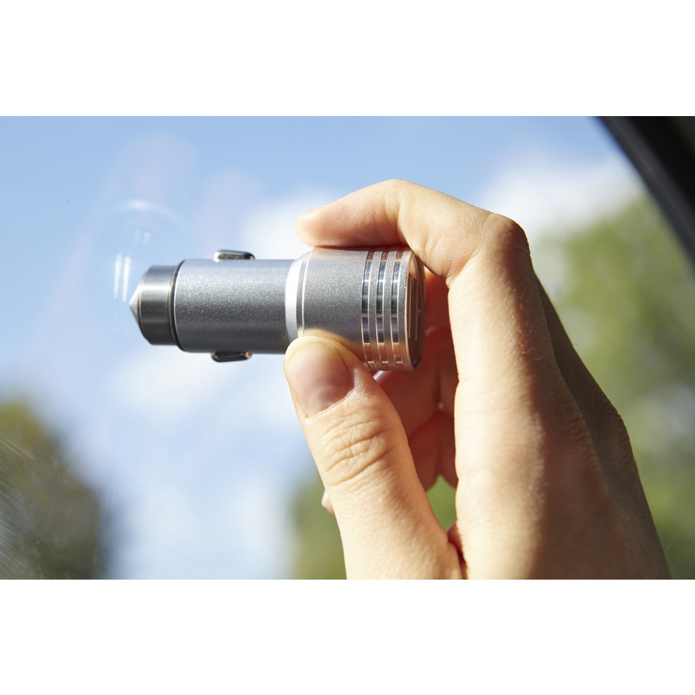 Autós adapter 2 USB kimenettel és vészhelyzeti ablalktörésre alkalmas véggel. Bemenet: DC 12-24V, kimenet: DC 5V/2.4A. Műanyag.