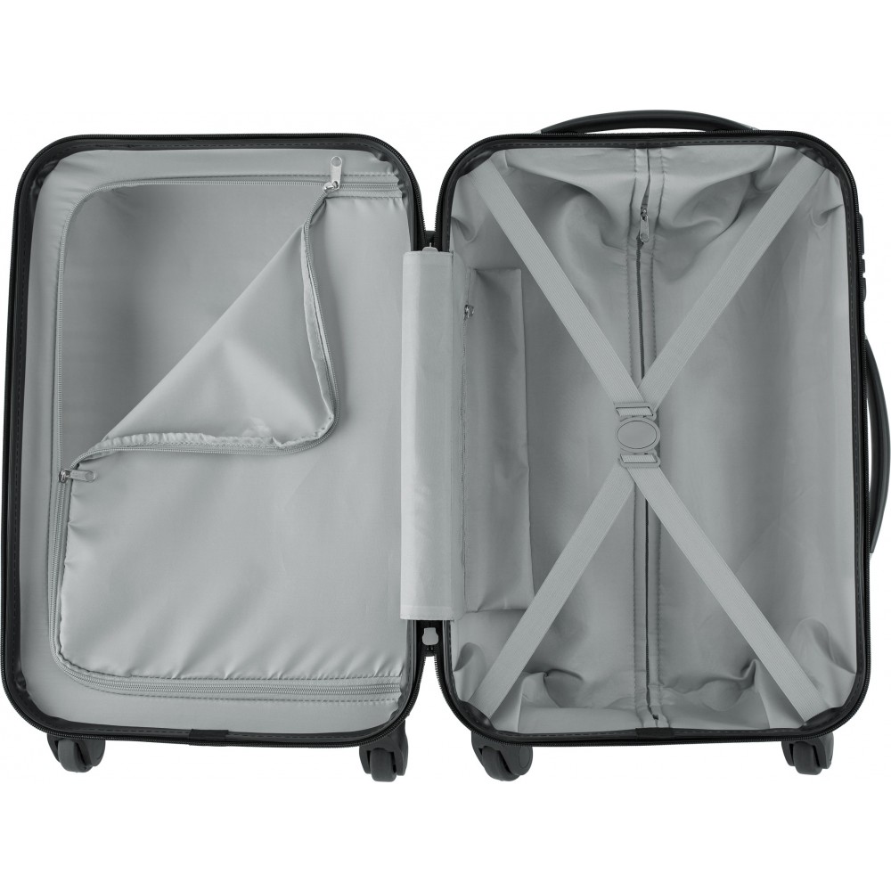 Keményfedelű bőrönd ABS műanyagból, 4 körbeforgó kerékkel, beépített számzárral. Emblémzásra alkalmas fémlapot tartalmaz.