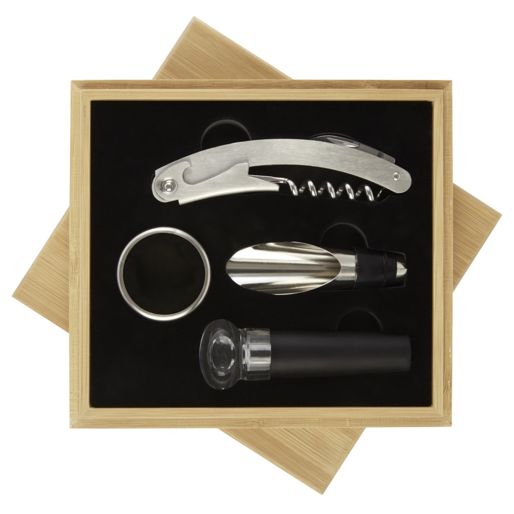 4 darabos boroskészlet pincérbicskával, dugóval, kiöntővel és cseppfogóval. Csomagolása bambuszdoboz. A bambuszt a fenntarthatósági előírások alapján termesztették.