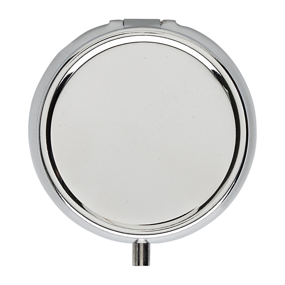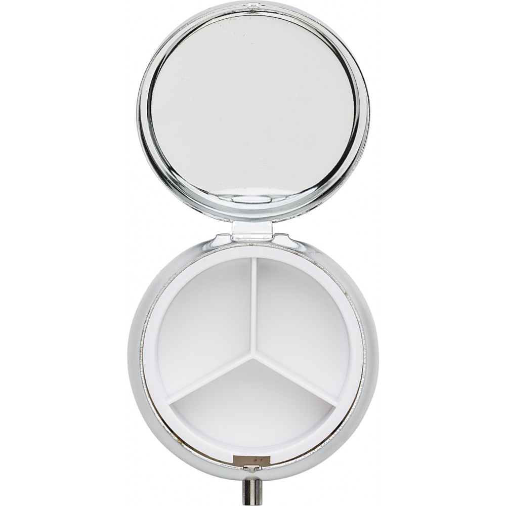 Fényes gyógyszeresdoboz 3 rekesszel. Belül PP műanyag. A fedél belsejében tükör található. Csomagolása: fehér doboz.