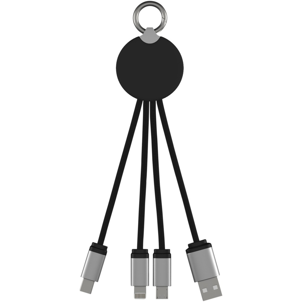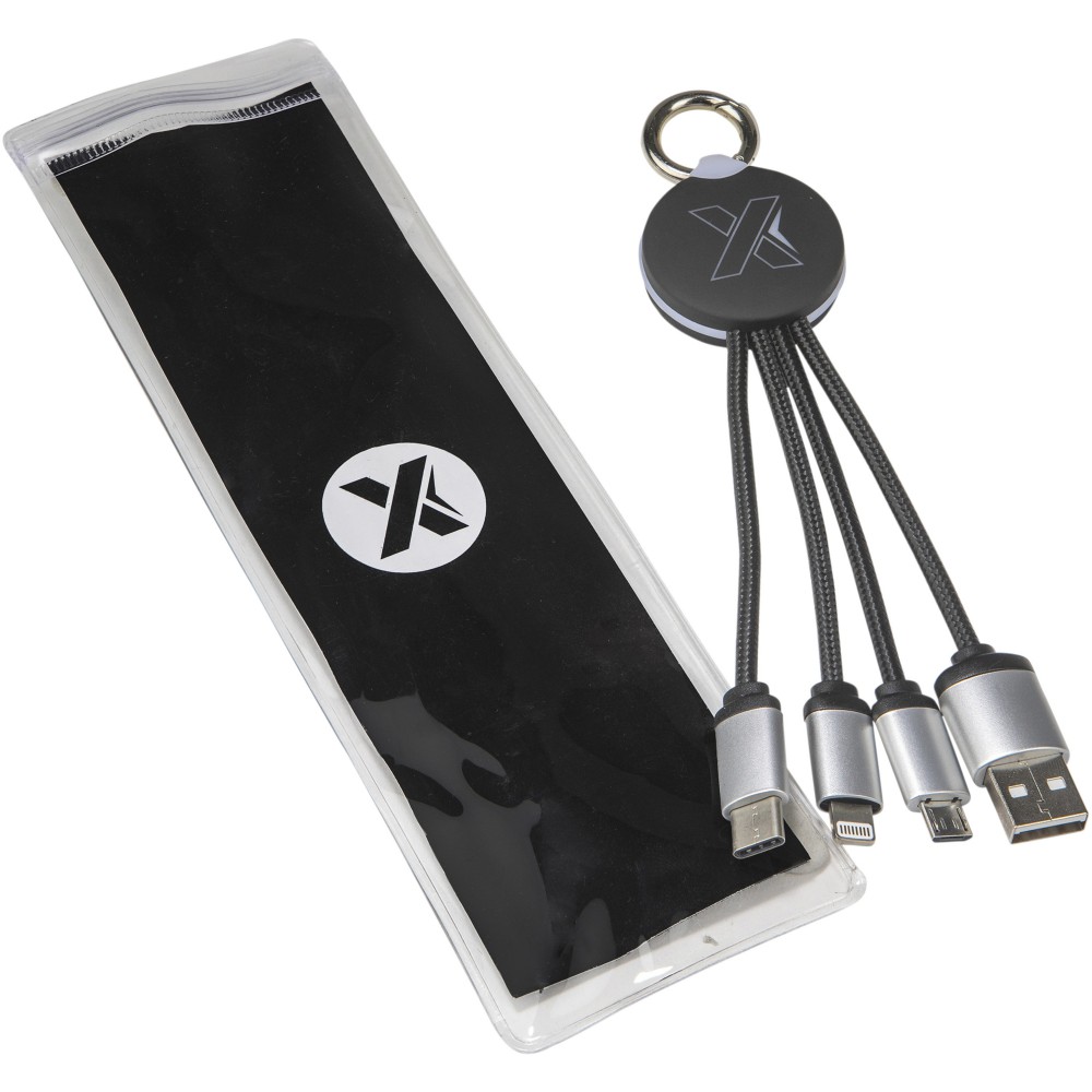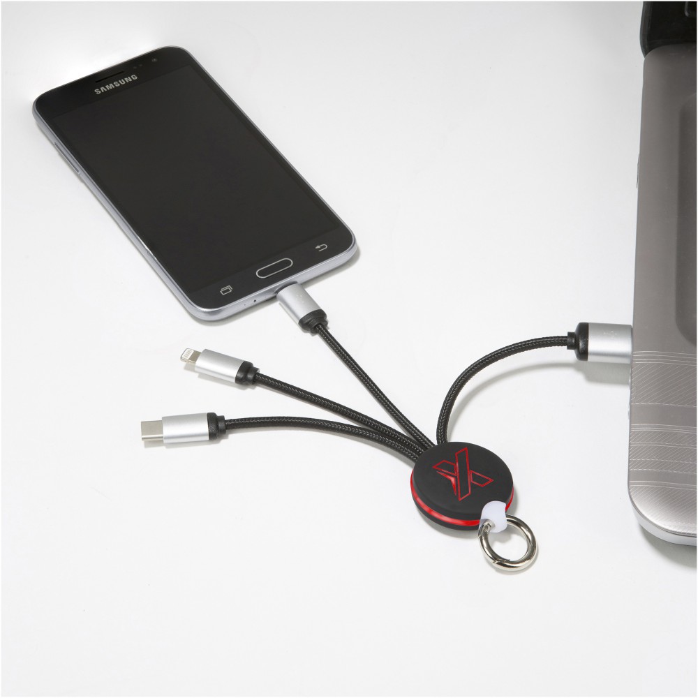 Világító logós töltőkábel gumi és fém bevonattal, három csatlakozóval (Type-C, Android, iPhone). Egyszerre akár három készülék is tölthető. Kábelek hossza (dugókkal együtt): 10 cm. Az újrahasznosított PET műanyag kábel és csomagolás újrahasznosított papírból és újrahasznosított műanyagból készül.