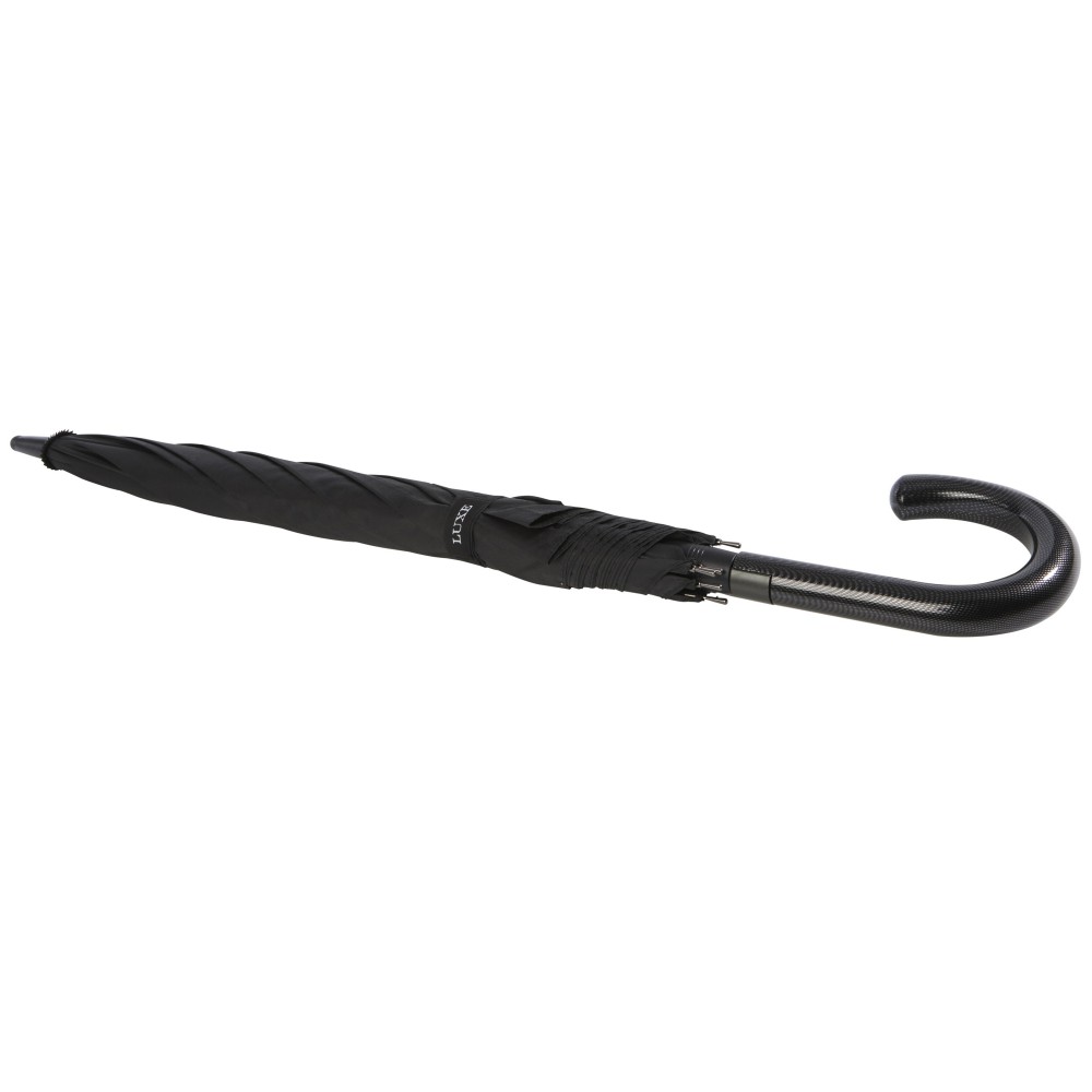 Automatikusan nyíló esernyő pongee poliészter vászonnal és erős, fekete bevonatú vázzal. A kiváló minőségű üvegszálas keret maximális rugalmasságot kínál szeles körülmények között. Görbe fogantyú karbon megjelenésű felülettel és fekete nikkelezett végekkel. Luxe márkajelzés a szőtt címkén a vásznon és a zárópánton. Nagy dekorálható terület minden panelen.