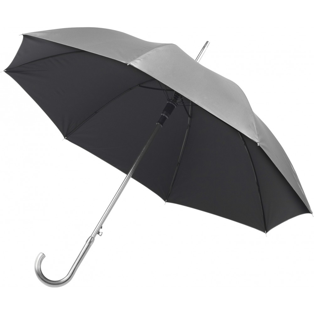 Automata esernyő. 8 panellel, selymes belső felülettel, fényes alumínium kerettel és hajlított nyéllel. Nylon.