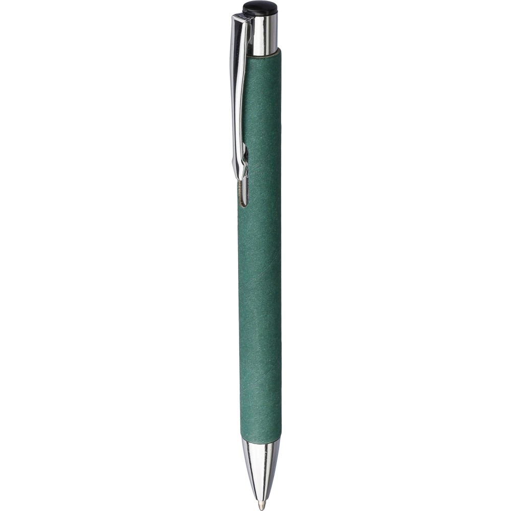 Újrahasznosított kartonból készült golyóstoll krómozott részletekkel. Műanyag tollhegy és nyomógomb, fém klipsz. Kb. 800 méter íráshossz. Fekete tollbetéttel.