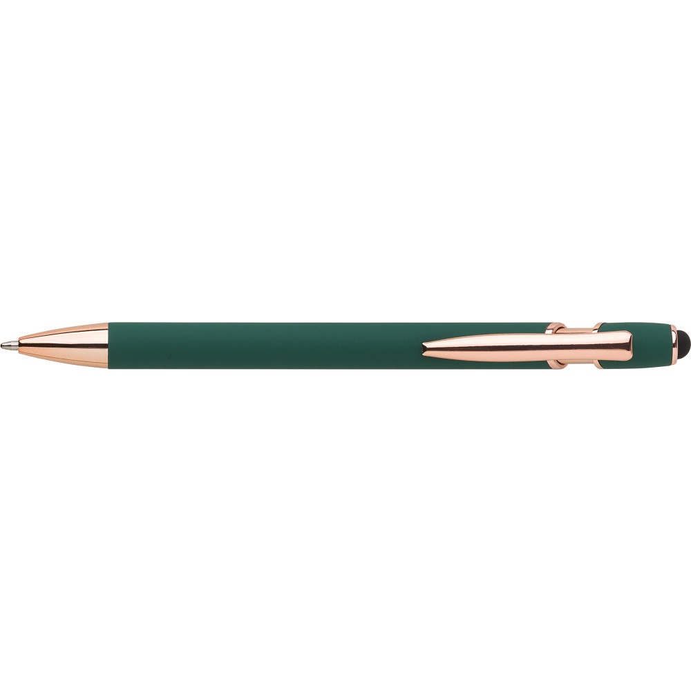 Alumínium golyóstoll rózsaarany részletekkel és érintővel, kék tollbetéttel.