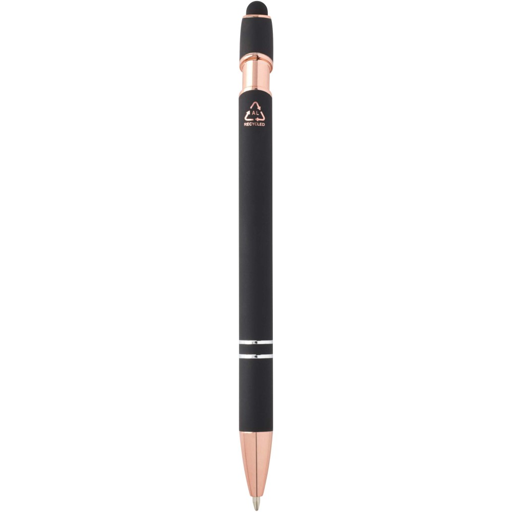 A Nanna golyóstoll rózsaarany bevonattal újrahasznosított alumíniumból készült tolltesttel és szilikon, érintőképernyős véggel rendelkezik. Az újrahasznosított alumínium csökkenti a hulladék mennyiségét a lerakókban, hozzájárul a természeti erőforrások megőrzéséhez és a károsanyag-kibocsátás mérsékléséhez. Tinta színe: fekete. Íráshossz: 800 méter. Tollhegy mérete: 1,0 mm.