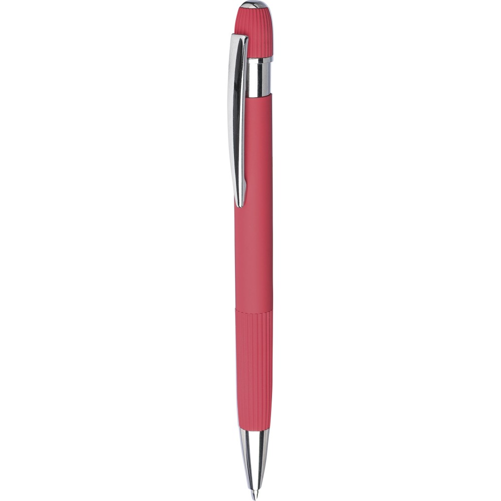 Újrahasznosított alumínium golyóstoll gumírozott felülettel. Bordázott részletekkel a markolaton és a tetején, krómozott műanyag heggyel és fém klipsszel ellátott nyomógombbal. Lézergravírozott újrahasznosított logóval. Kék tintával.