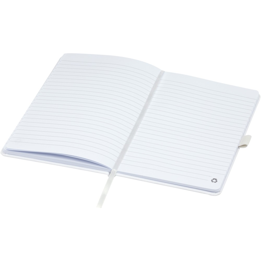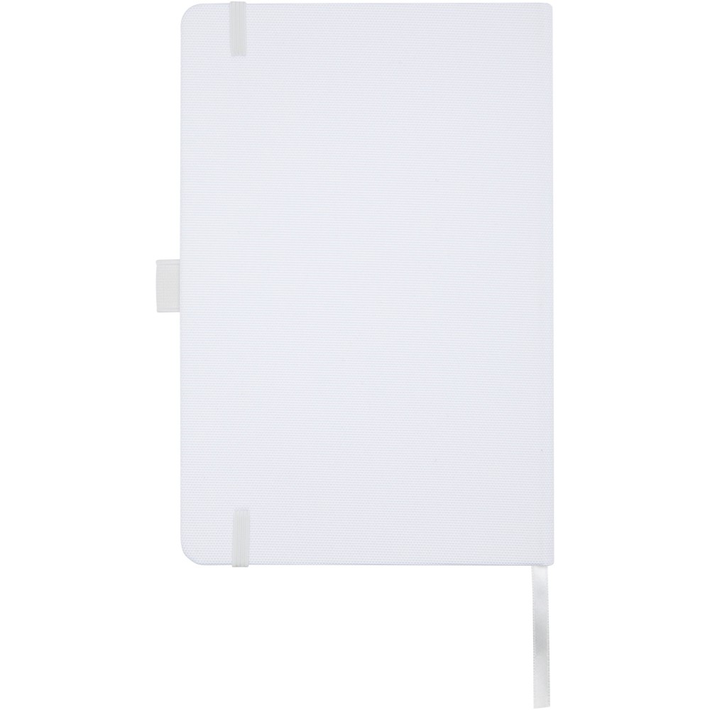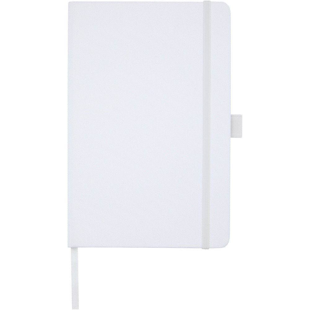 A5 jegyzetfüzet újrahasznosított PET műanyagból készült szövet borítóval. 80 lap 70 g/m2 újrahasznosított, vonalas papír, tolltartó hurok és szalag könyvjelző. Kombinálható a 107757 Honua RPET golyóstollal.