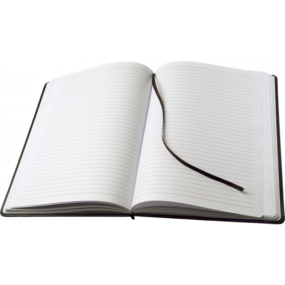 A4-es jegyzetfüzet PU borítással, 100 lappal, jelzőszalaggal.