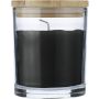 Üveg gyertyatartó 120 g vanília illatú, színes viasszal és bambusz fedéllel. Kb. 20 óra égési idővel. Csomagolása fehér papírhenger.
