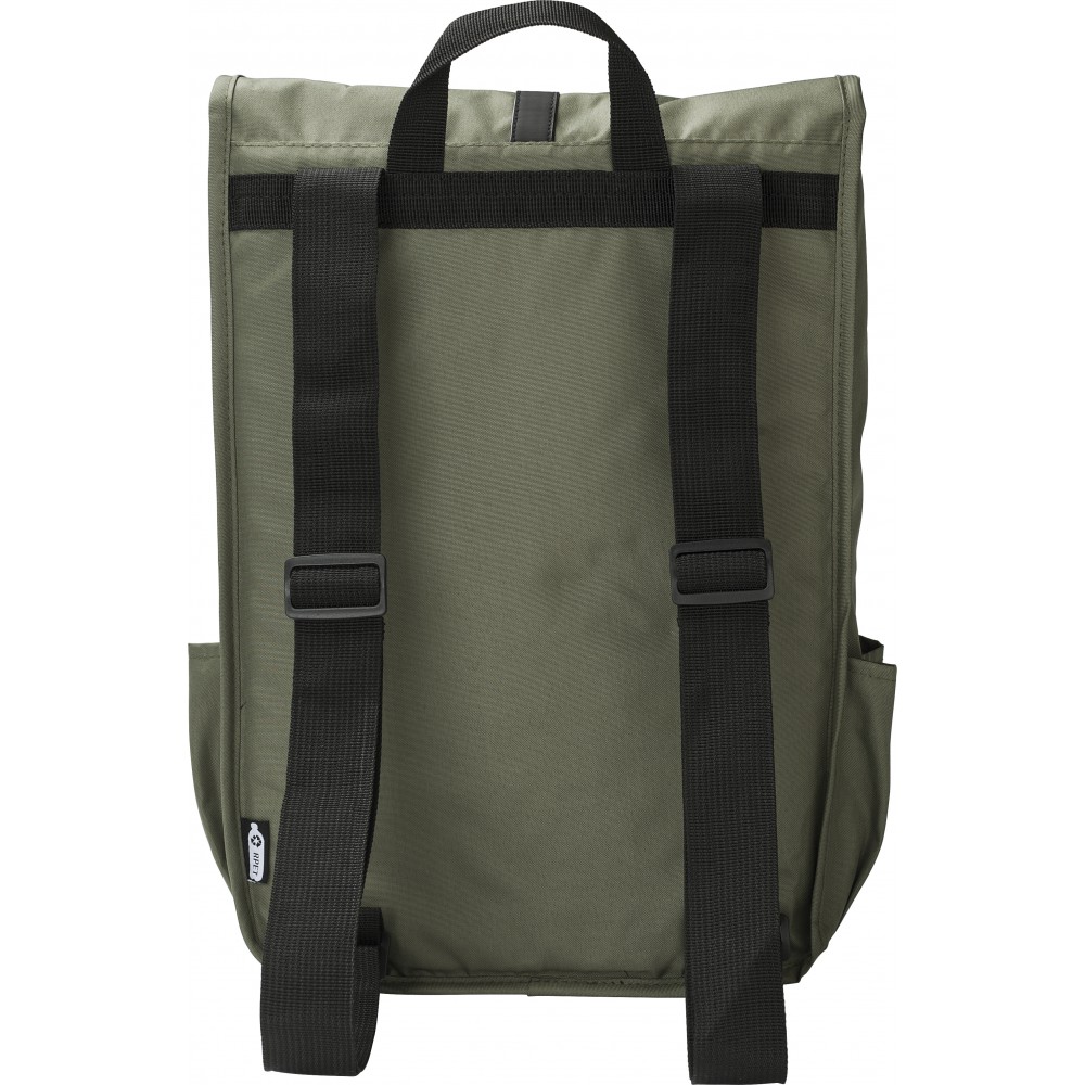 Hátizsák. Két palackzseb az oldalán, egy nagy rekesz. Fekete PU pánttal, csattal zárható. 300D RPET poliészter.