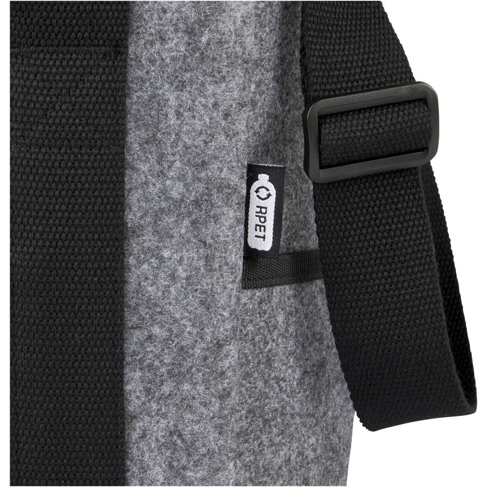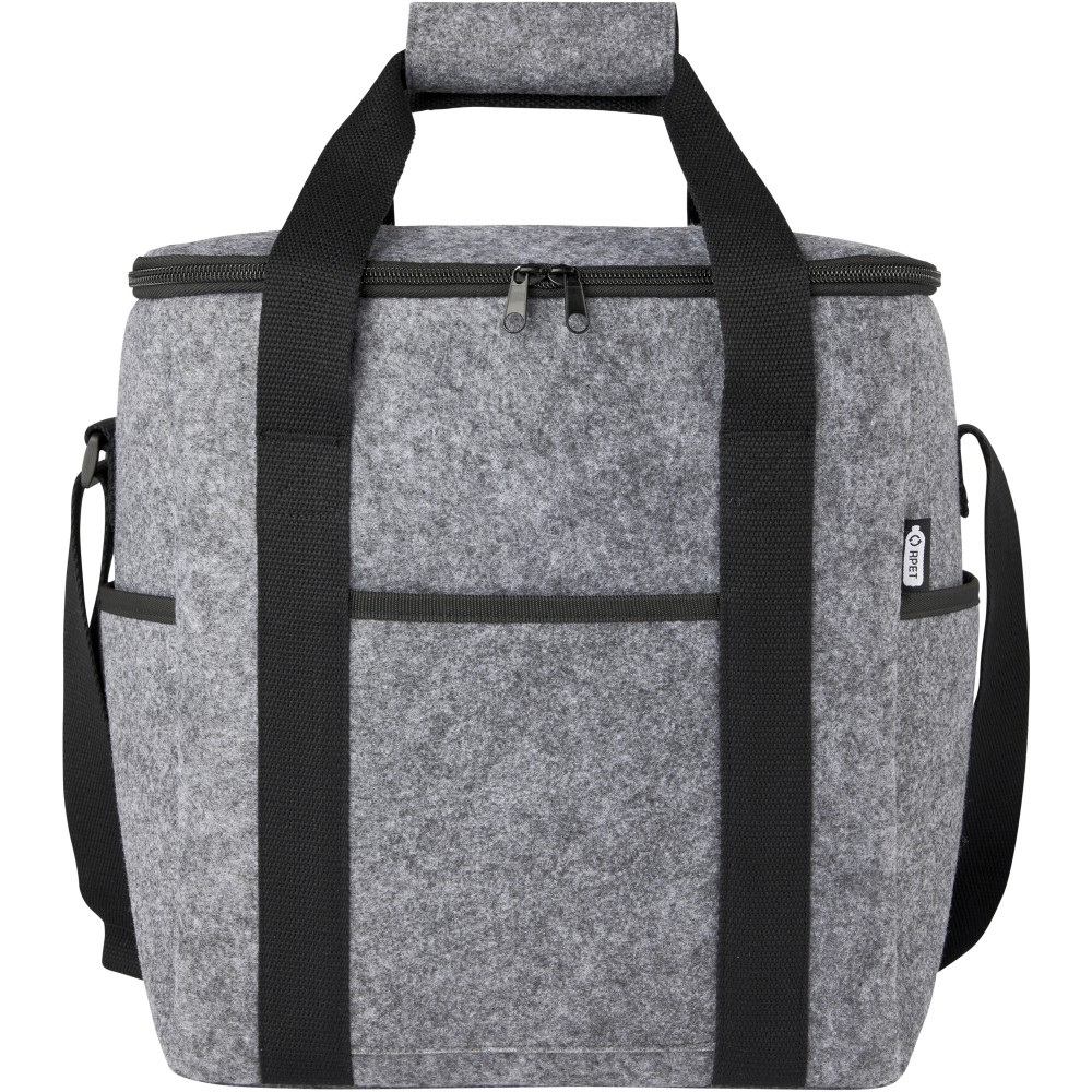 Nagyméretű hűtőtáska kiváló minőségű puha és tartós, GRS tanúsítvánnyal rendelkező újrahasznosított filcből. Tartalmaz egy nagy fő rekesszel (hat 1,5 literes palack), amely élelmiszer-biztonságos és extra vastag, nagy sűrűségű PEVA hőszigeteléssel van bélelve, amely órákon át hidegen tartja az italokat és a frissítőket. Felső cipzáras záródás, elülső zseb és két oldalsó zseb extra tároláshoz. Állítható hosszú pamut szőtt vállpántok (55 x 3,8 cm) és 2 szőtt pamut fogantyú (25 x 3,8 cm), felső kampóval és hurokkal zárható. Könnyen tisztítható. Űrtartalom: 21 liter. GRS tanúsítvánnyal rendelkező újrahasznosított poliészter.