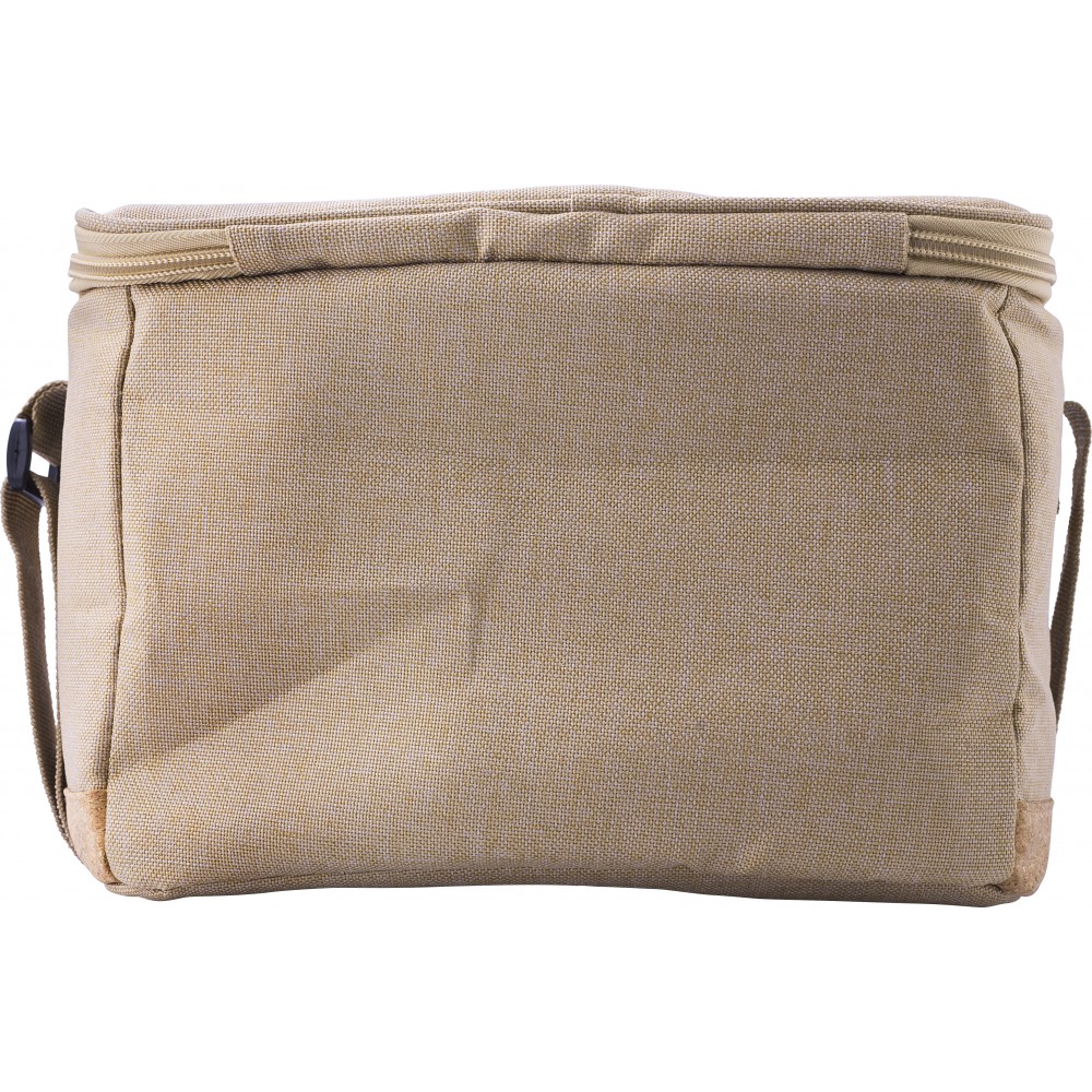 Hűtőtáska parafa aljjal, EVA szigetelő béléssel, állítható vállpánttal. Elülső oldalán egy kis zseb található. 600D RPET poliészter.