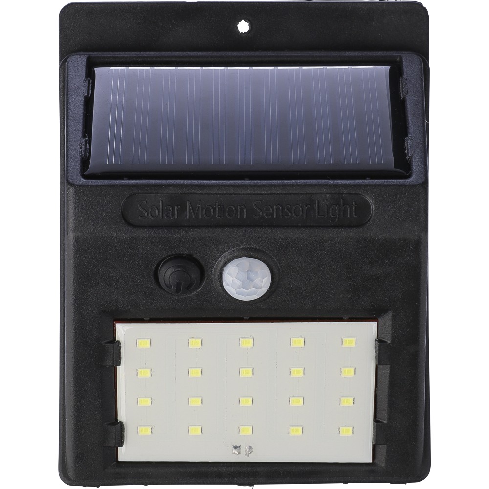 Napelemes lámpa 20 COB LED-del. Éjjeli érzékelővel (CDS) és mozgásérzékelővel (PIR). 800 mAh-s akkumulátorral, töltőkábellel, IP44 besorolással és állandó vagy villogó funkciókkal. Csomagolása barna papírdoboz. PP.