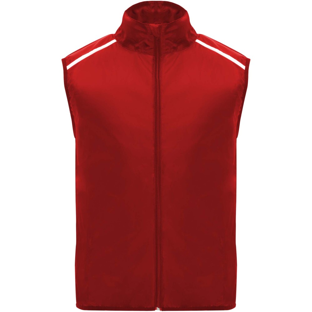 Szélálló és légáteresztő. Elülső cipzár azonos színű állvédővel. Rugalmas szegély a karkivágásnál és az alján. A hát alsó része mikroperforált anyagból készült. Fényvisszaverő csíkok a vállán. Zseb rugalmas pánttal, amelybe a mellényt el lehet csomagolni. Eltávolítható címke.