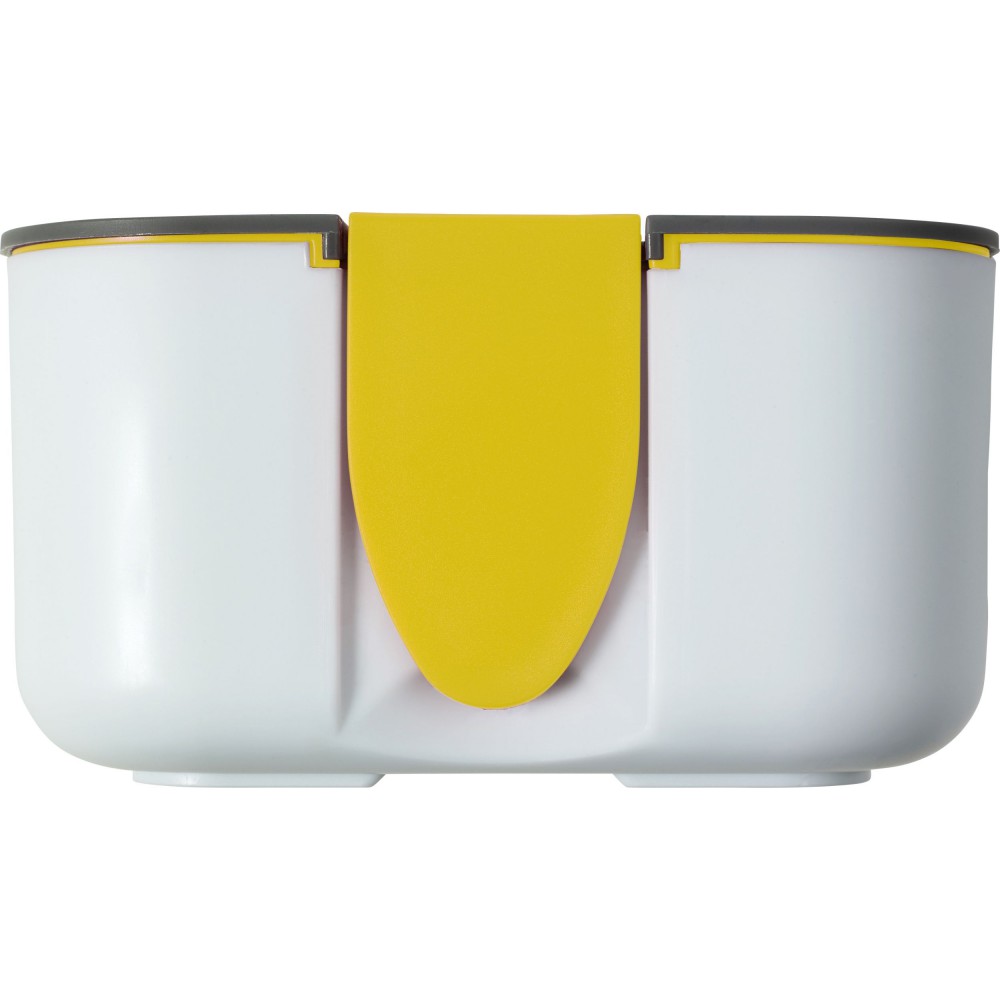 Ételdoboz egy belső elválasztóval. A fedélen lévő zárószerkezet telefontartóként is használható. Fedél nélkül mikrózható, csak a doboz. Űrtartalom: 850 ml. PP BPA-mentes műanyag.