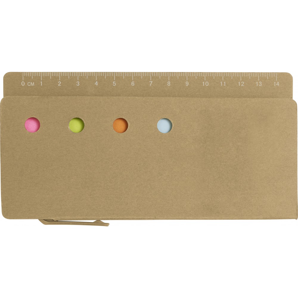 Karton tartó vonalzóval. Tartalma 4 különböző, kisméretű, öntapadó jegyzettömb, 1 nagyobb méretű öntapadó jegyzettömb és egy golyóstoll kék tollbetéttel.