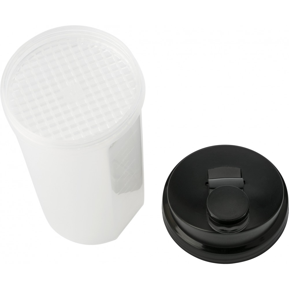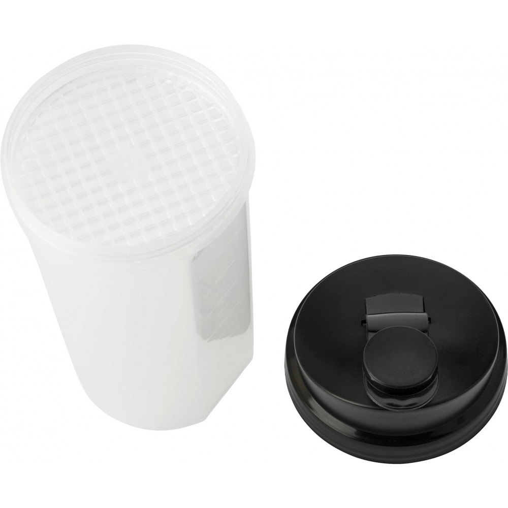 Műanyag protein shaker (kb. 700 ml-es) szűrővel és színes fedéllel, egyik oldalán ml, másik oldalán OZ beosztással. Nem szivárgásmentes. Mosogatógépben nem tisztítható. BPA-mentes műanyag.