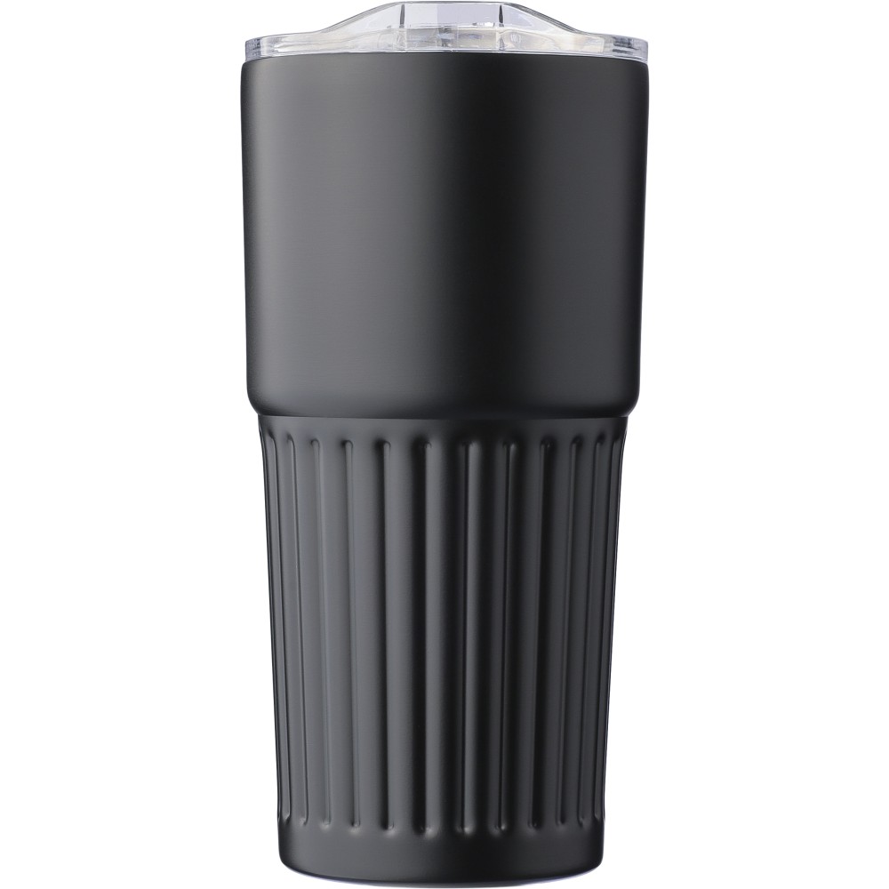 Újrahasznosított rozsdamentes acél útibögre, 450 ml. A belső 304-es, a külső 201-es rozsdamentes acélból készült, bordás markolattal, műanyag, csúszózáras fedéllel. Gravírozott újrahasznosított logó található a bögrén. Csomagolása barna papírdoboz.
