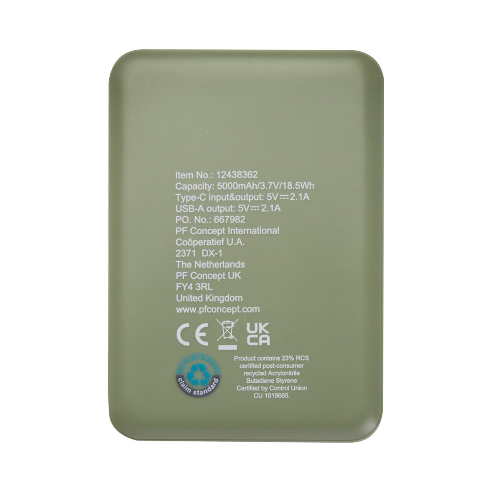 Karcsú és elegáns kialakítású powerbank, Type-C bemeneti/kimeneti porttal és 2 db USB-A porttal, amelyek lehetővé teszik három eszköz egyidejű töltését. A powerbank 5000 mAh kapacitású lítium-polimer akkumulátorral rendelkezik, amely max. 10W teljesítményt biztosít. A powerbank 23%-ban RCS tanúsítvánnyal rendelkező újrahasznosított műanyagból készült. TPE Type-C - USB-A töltőkábellel szállítjuk.