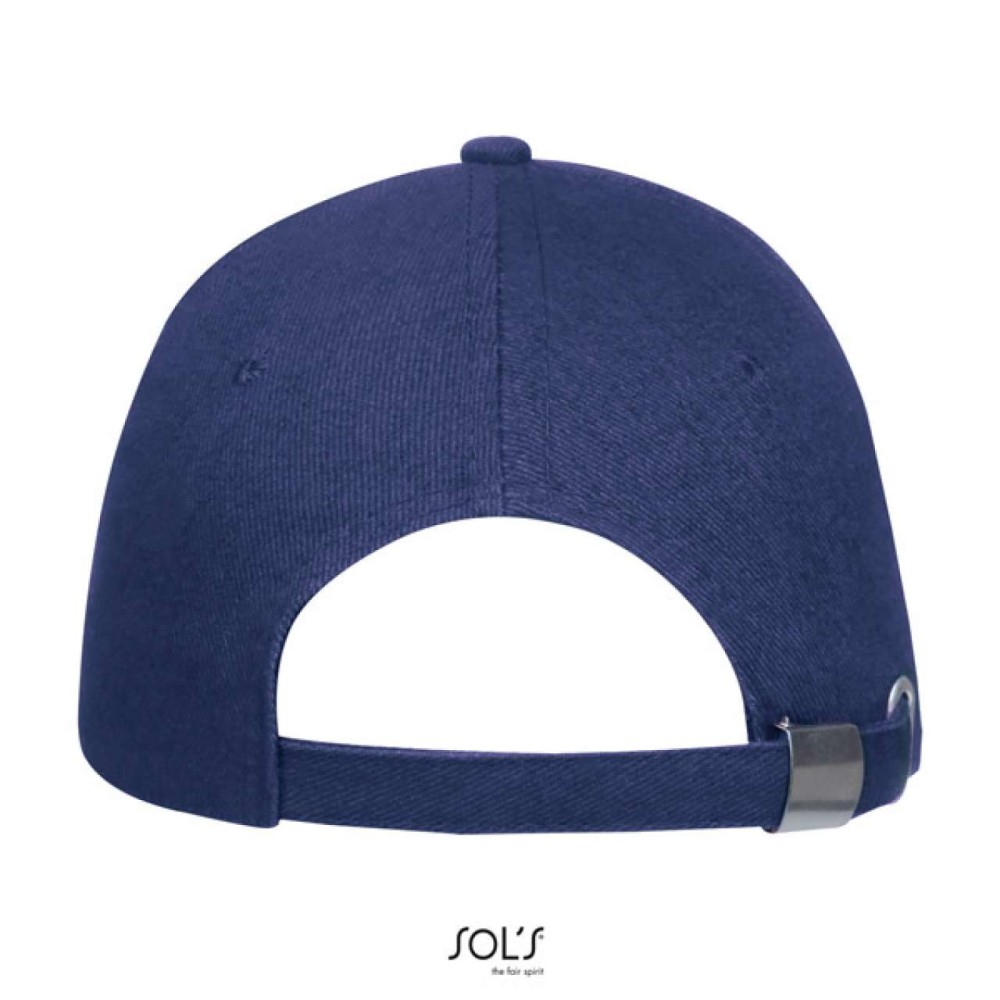 100% pamut vastag anyag, 260 g/m2. Formázott simléder, szellőzőnyílások, fém csattal fejméretre állítható.