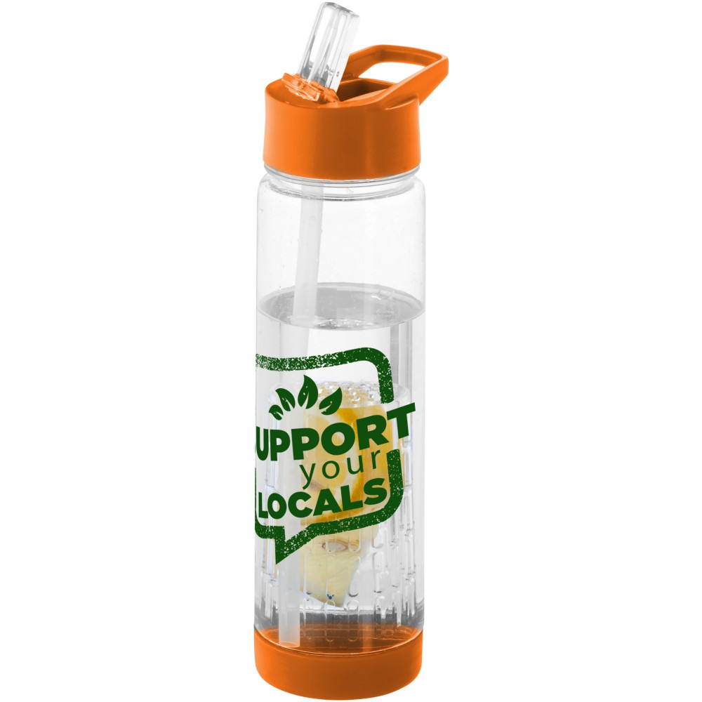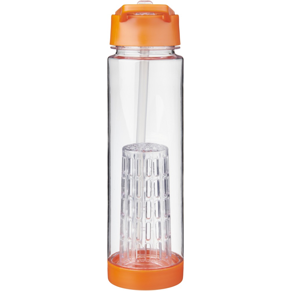 Tutti Frutti palack szűrőbetéttel, csavaros kupakkal, felpattintható ivócsővel. A szűrőbetétnek köszönhetően italunkba könnyen szűrhető módon tehetünk gyümölcsöt, zöldfűszert, zöldséget: mentát, citromfüvet, uborkát, levendulát, stb. A palack Eastman Tritan anyagból készült, így BPA-mentes, könnyű, tartós, szagmentes és ütésálló. Nem szivárgásmentes. Szénsavas italokkal nem használható. Mosogatógépben nem mosható és mikrohullámú sütőben történő melegítésre nem alkalmas. Űrtartalom: 740 ml.