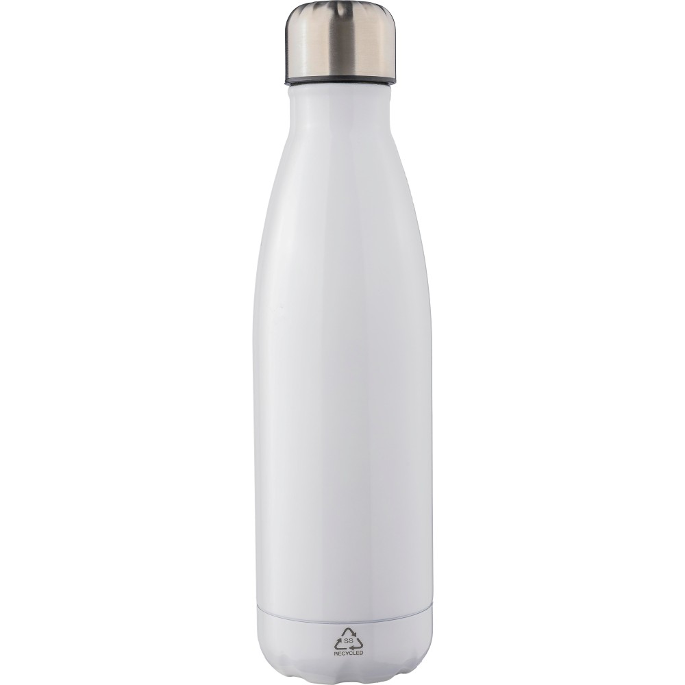 Újrahasznosított rozsdamentes acél, duplafalú kulacs csavaros kupakkal. A belső rész 304-es rozsdamentes acélból, a külső rész 201-es rozsdamentes acélból készült. Az újrahasznosított logó gravírozva van a kulacson. Egyenként barna kartondobozba csomagolva. Űrtartalom: 500 ml.