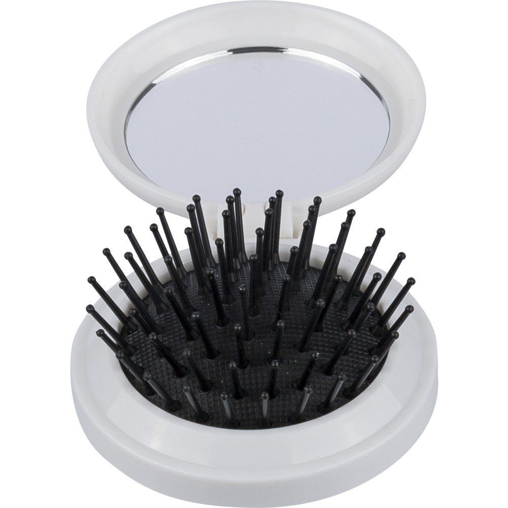 Újrahasznosított ABS-ből hajkefe és tükör, praktikus kialakítású útközbeni használatra, a terméken újrahasznosított alapanyagra utaló megjelölés található.