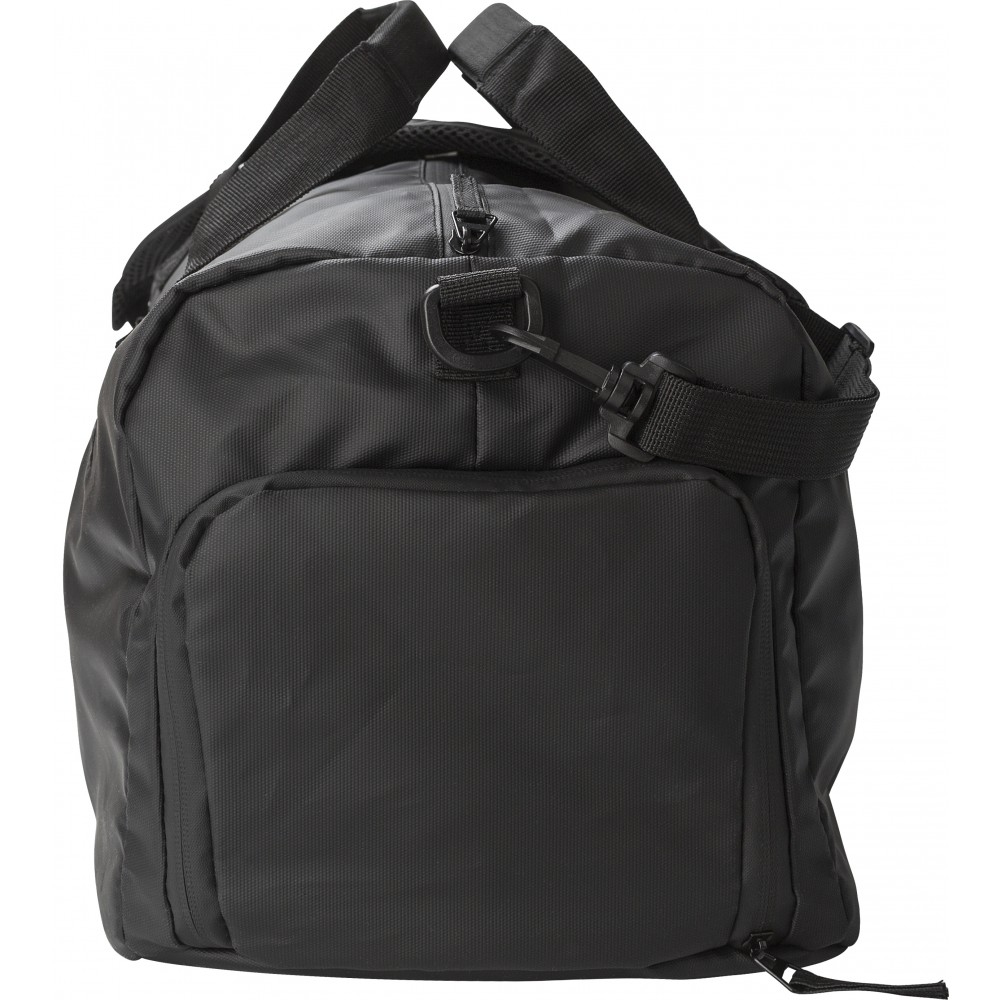 Vízlepergető táska 600D + 210D poliészter anyagból, bevonattal. Fedett cipzárak a vízlepergető funkció megtartása érdekében. Megerősített alj. Állítható pántok, rövid fogantyúk, cipőzseb és mindkét oldalon cipzáras zseb. Szettet alkothat a 1014895 vízlepergető hátizsákkal.