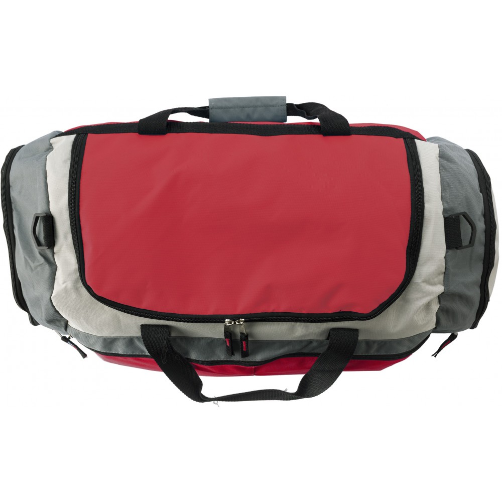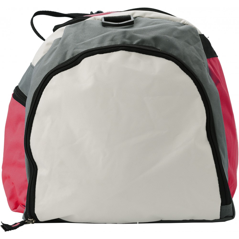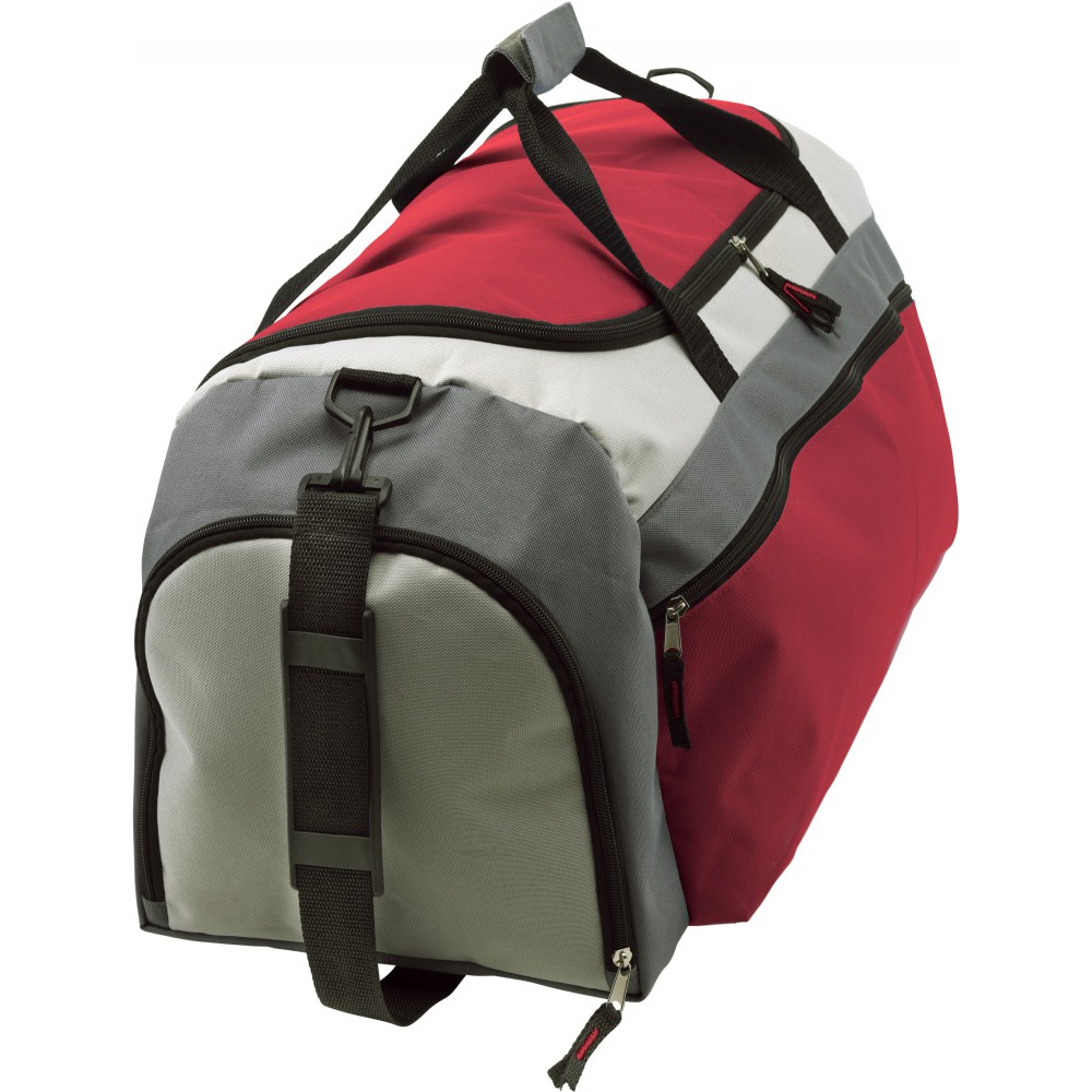 Nagy sporttáska két cipzáras zsebbel a táska végén és egy zsebbel az elején, állítható vállpánttal.